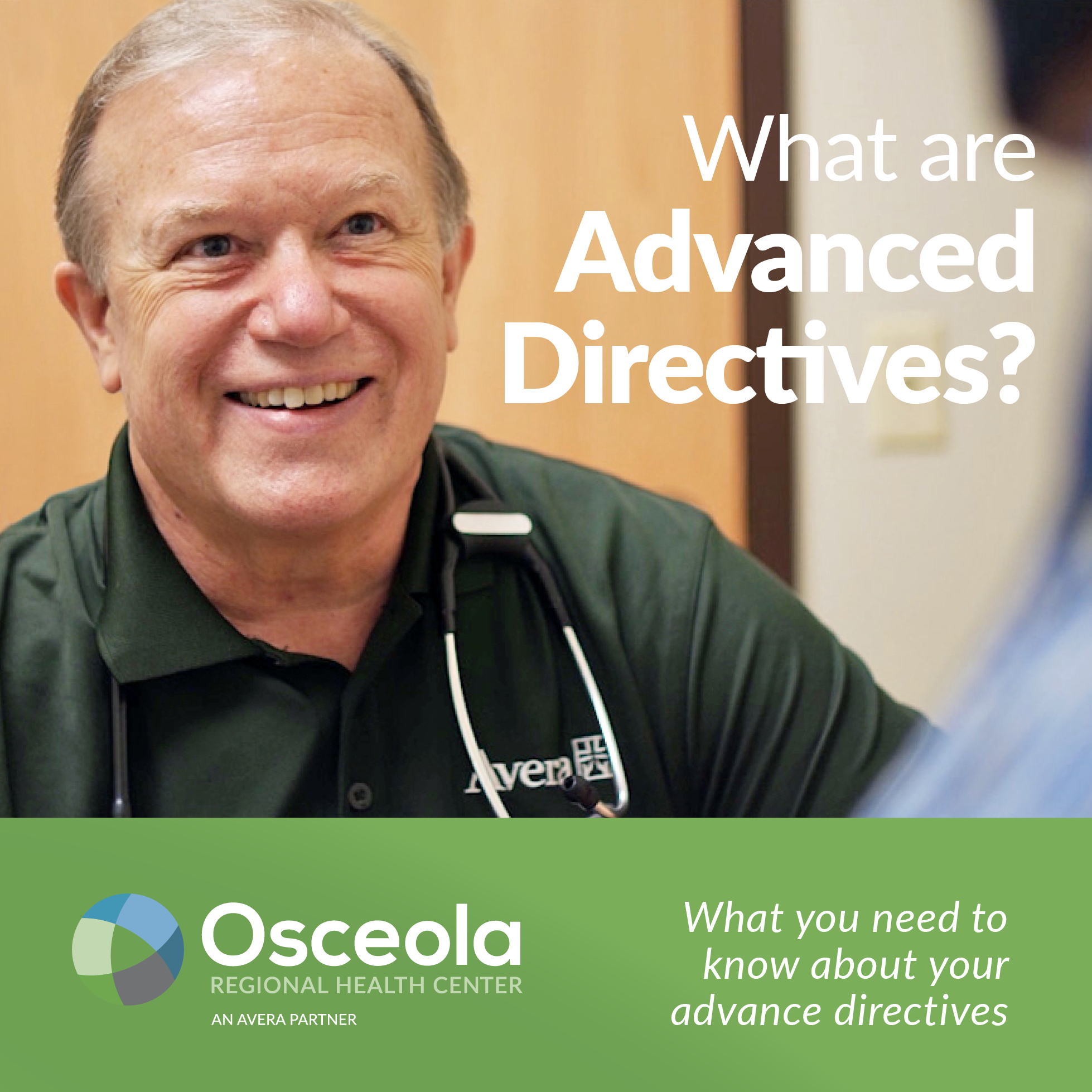 Dr. Kosters will be teaching us about Advanced Directives in the Multi-purpose room at Osceola Regional Health Center. -